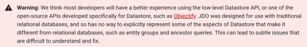I just wished Google would be a little more direct and say ‘you have to migrate from JDO to Objectify in order for your app to work here in 2025 Q3’ instead of this vague warning:
